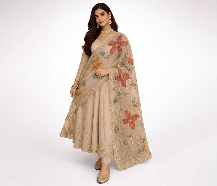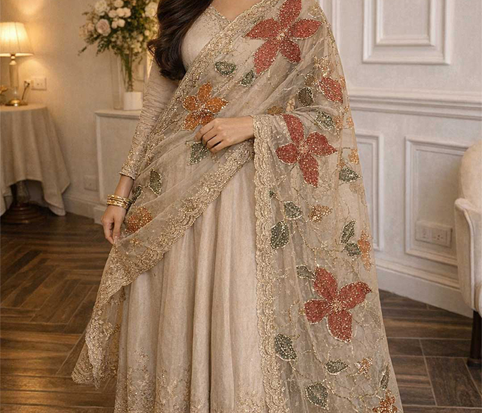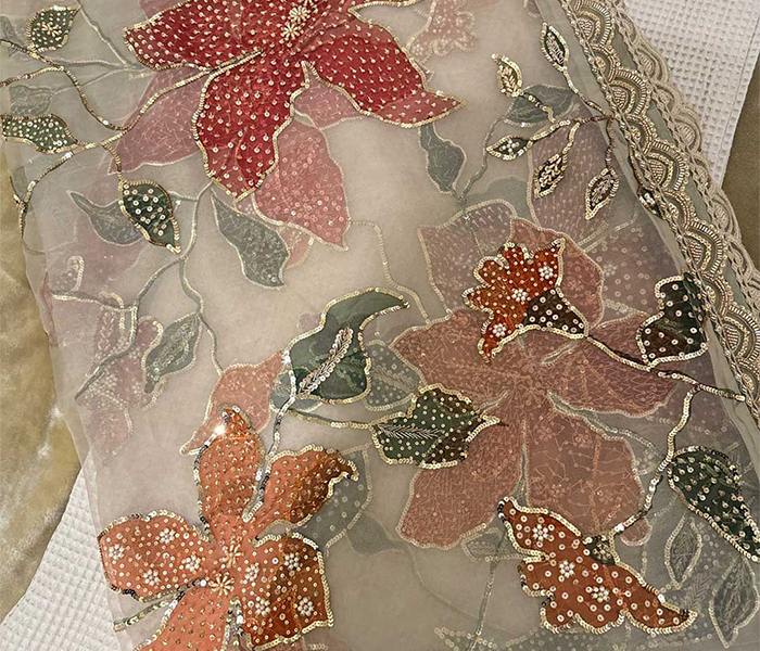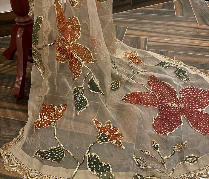 This pure organza dupatta is hand painted using premium silk colors and finished with fine sequence embellishment work. Lightweight, elegant, and available in customized colors. Limited pieces only.