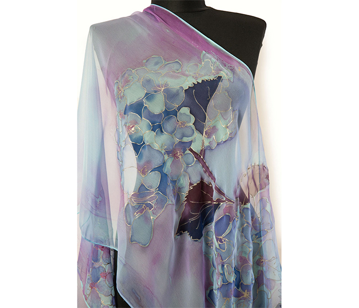 An ethereal hand painted luxury silk scarf inspired by the softness of morning mist and blooming hydrangeas.