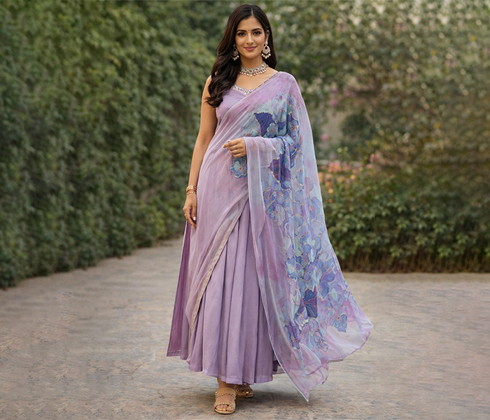 An ethereal hand-painted luxury Chiffon Dupatta inspired by the softness of morning mist and blooming hydrangeas. Crafted from 100% natural silk chiffon, this delicate lavender-purple wrap captures the romance of watercolor-painted flowers in lilac, blue, pink, and deep purple.